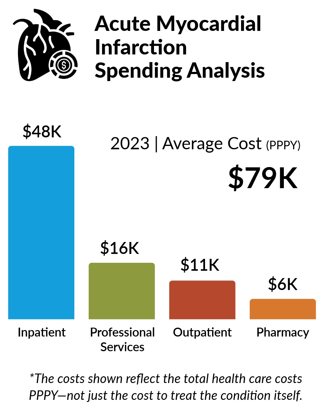Acute Myocardial Infarction, more commonly known as a heart attack, occurs when an area of the heart muscle is damaged or dies after blood supply is blocked. In 2023, the average overall spending per person per year (PPPY) was $78,718-the highest of the four highlighted heart-related conditions. From 2017–2023, overall average PPPY costs for individuals with acute myocardial infarction increased by 17.4%.