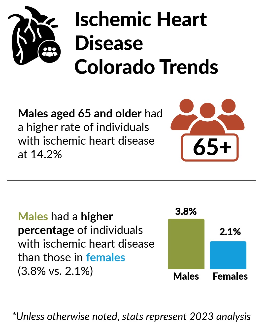 Ischemic Heart Disease is heart damage caused by narrowed heart arteries. This is also called coronary artery disease and coronary heart disease. When arteries narrow, less blood and oxygen reach the heart muscle. This can lead to heart attack. From 2017–2023, the share CO APCD members with ischemic heart disease increased slightly from 2.8% to 2.9%. Males had a higher rate of individuals with ischemic heart disease at 3.8% compared to females at 2.1%. Older males 65 years of age and up had the highest at 14.2%, down from 15.8% in 2017. This is similar among rural and urban communities.