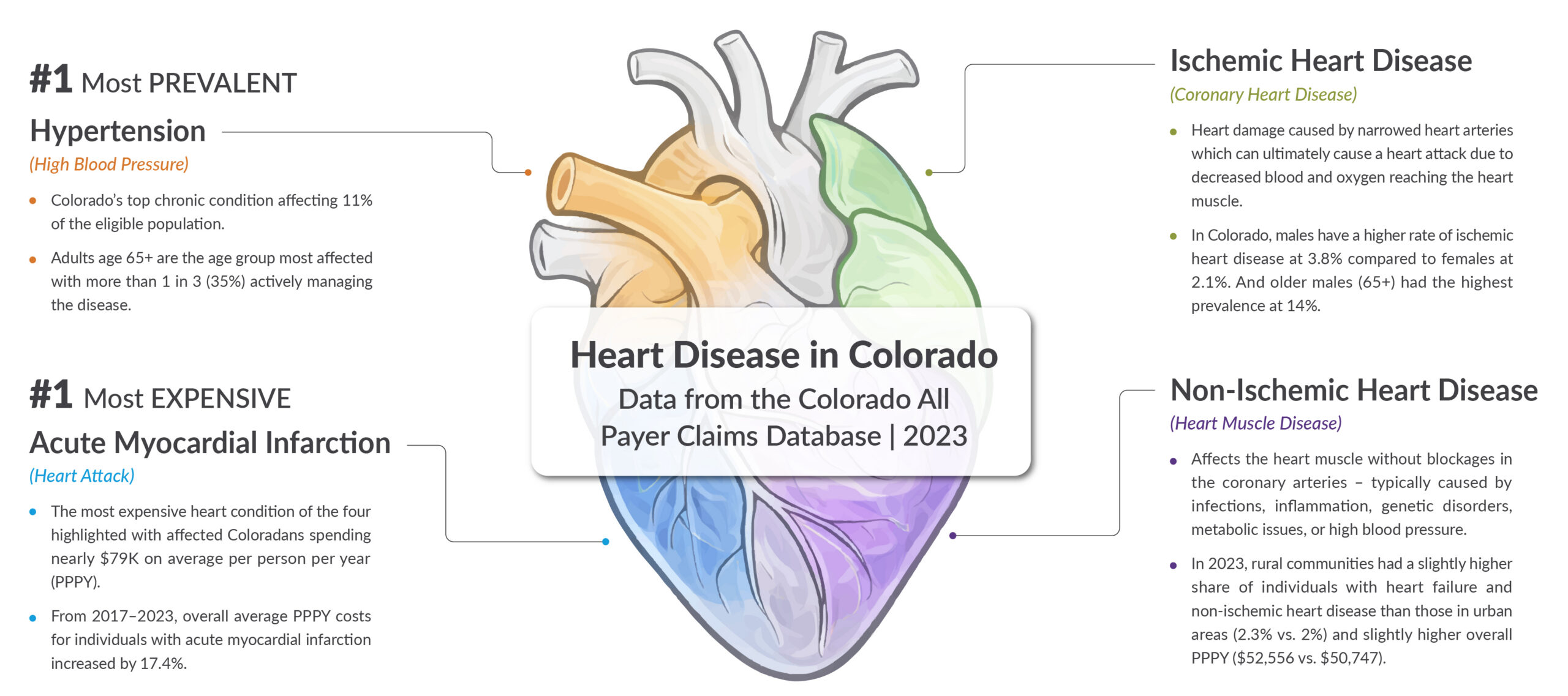 Heart-related chronic conditions continue to impact thousands of Coloradans, especially older adults and rural populations. While Colorado leads the nation in low hypertension rates, the prevalence and cost of heart-related conditions remain significant and deserve continued attention.