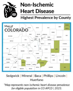 Non-Ischemic Heart Disease affects the heart muscle without blockages in the coronary arteries. These may result from infections, inflammation, genetic disorders, metabolic issues, or high blood pressure. In 2023, rural communities had a slightly higher share of individuals with Heart failure and non-ischemic heart disease than those in urban areas (2.3% vs. 2%) and slightly higher overall all PPPY. ($52,556 vs. $50,747). The counties with the highest percentage of individuals living with the disease as of 2023 are: Sedgwick, Mineral, Baca, Phillips Lincoln, and Huerfano.
